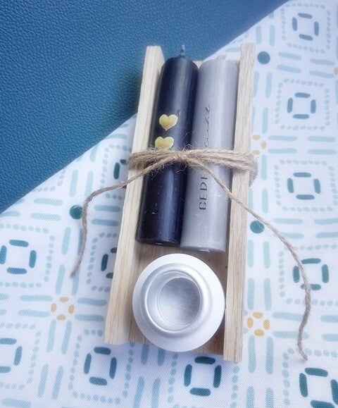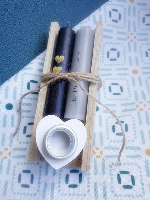 Kleiner Kerzenhalter Rund oder in Herzform inkl. 2 Stabkerzen in den Farben Schwarz und Grau. Mit kleinem Trauerspruch.