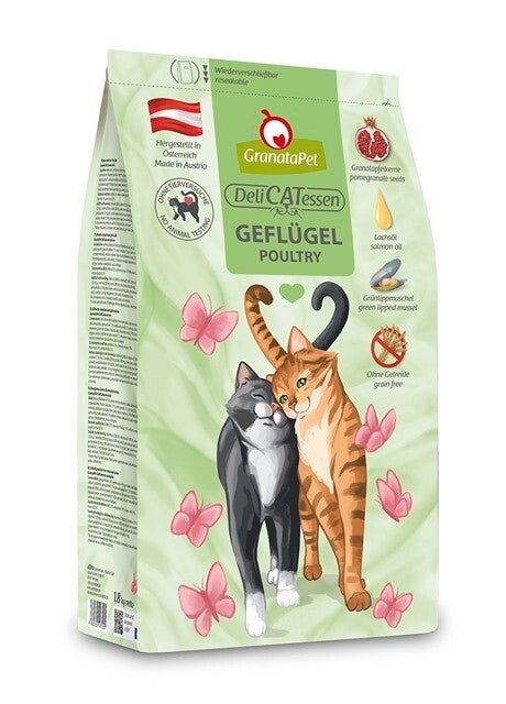 Das GranataPet DeliCATessen Trockenfutter wird ohne Tierversuche entwickelt und in Österreich hergestellt. Der schonende Herstellungsprozess sorgt dafür, dass wichtige Nährstoffe und Vitamine in den Zutaten erhalten bleiben. Dank der lecker duftenden Granatapfelkerne und der anregenden Katzenminze wird die DeliCATessen Mahlzeit auch von anspruchsvollen Leckermäulchen gerne verzehrt.