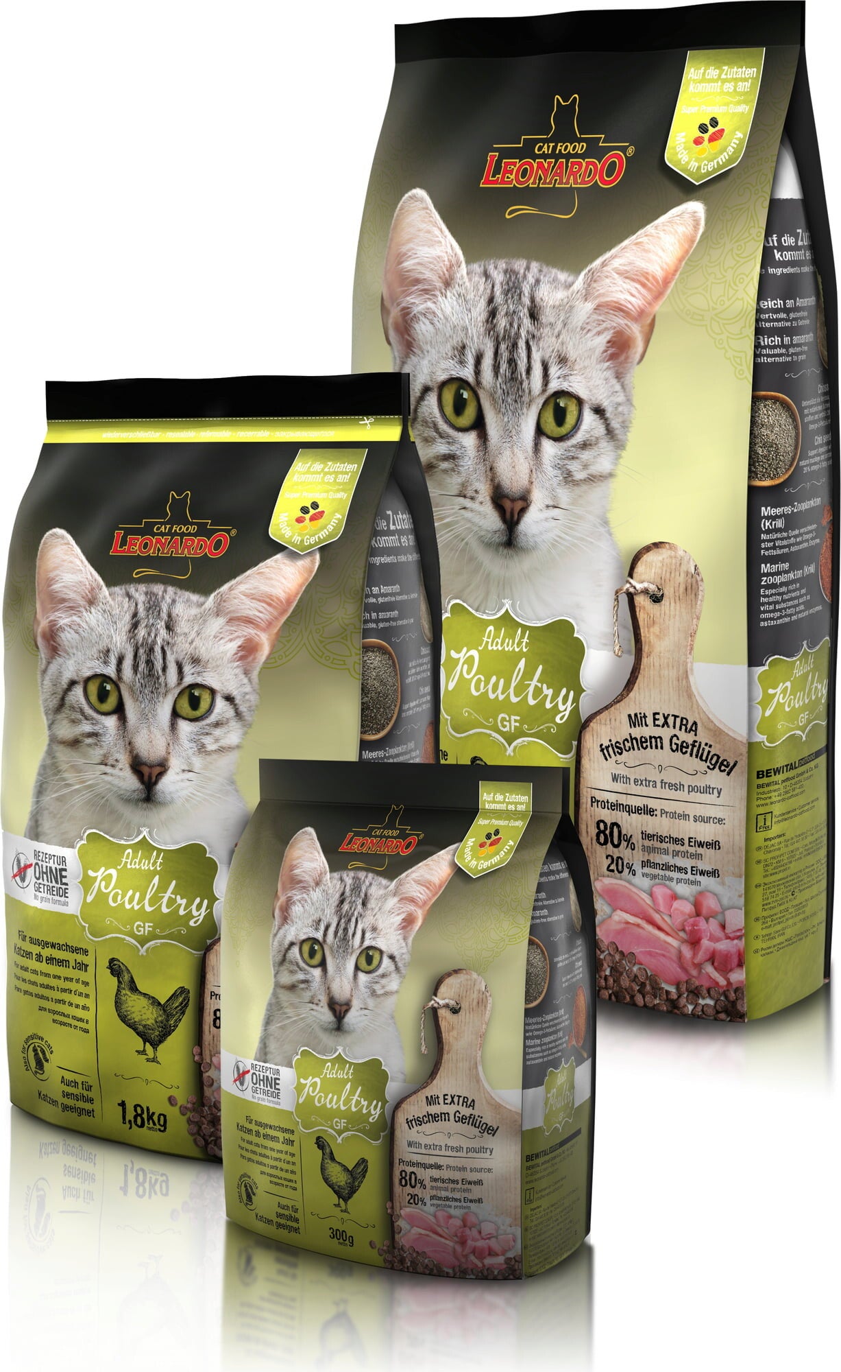 Bei der Rezeptur von LEONARDO Adult GF Poultry wurde auf den Einsatz von Gluten bzw. Getreide verzichtet. Nährstoffreicher Amaranth ersetzt in dieser Zusammensetzung das Getreide. Gerade bei Katzen mit Futtermittelunverträglichkeiten oder Katzen, die zu Allergien neigen, ist LEONARDO Adult GF Poultry die perfekte Lösung.