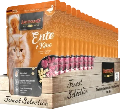 Das gewisse Extra: Ente sorgt für viel Geschmack im Napf und Käsewürfel bieten eine ganz besonders herzhafte Überraschung. Mit wertvollen Omega-3-Fettsäuren steigern sie zudem das Wohlbefinden unserer vierbeinigen Lieblinge. Ein weiteres Plus von LEONARDO Ente + Käse: weiches und glänzendes Fell – dank mehrfach ungesättigter Fettsäuren aus Lachsöl.